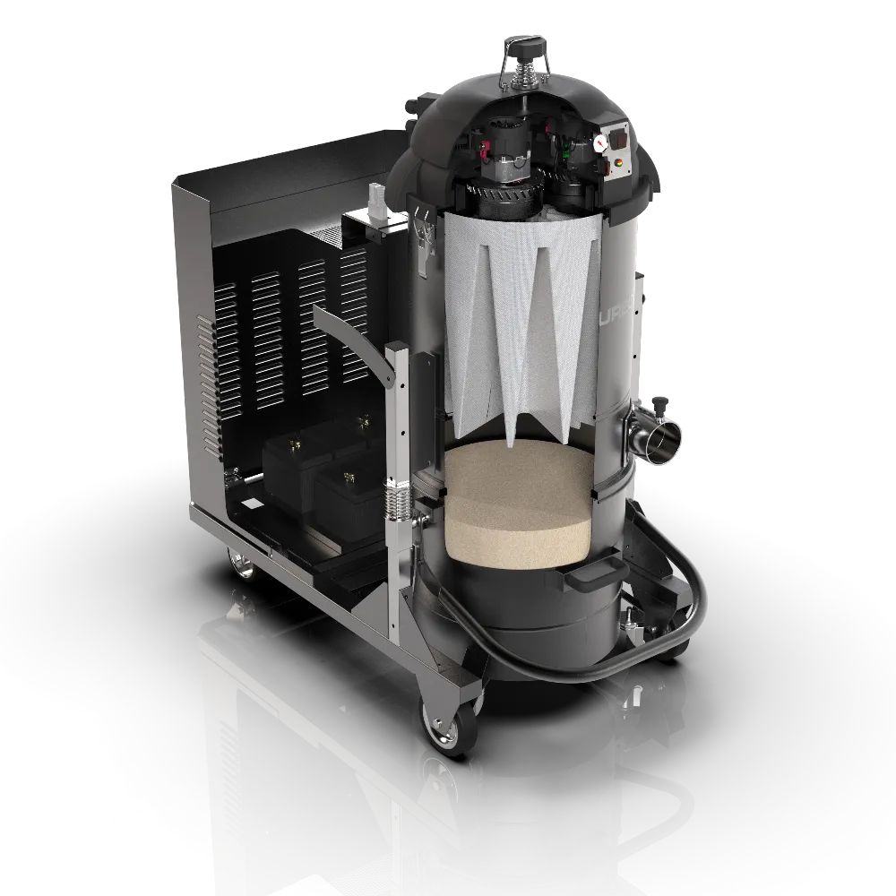 Fox 24, an innovative industrial vacuum engineered for autonomous operation without the need for external power. Powered by 24V motors, this vacuum offers unparalleled flexibility, working independently without cumbersome power cables.